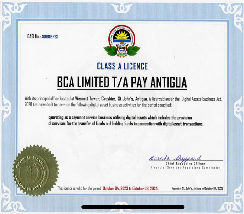BCA.Ltd, an entity trading under PayAntigua, is committed to adhering to the highest standards of compliance and regulatory oversight under the Digital Asset Business Act, 2020 No. 16 of 2020, which maintains a comprehensive Anti-Money Laundering/Counter-Terrorism Financing (AML/CTF) program. PayAntigua is independently audited for further compliance with applicable laws and regulations.